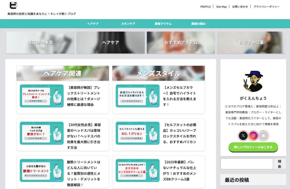 15年以上のキャリアを持つ現役美容師が、専門的な知見をもとにヘアケアや美容の悩みを解決するための情報を発信するブログです。トリートメントの効果や白髪を活かすカラー術といった技術的な解説に加え、美容室でのマナーや節約術など、読者の日常生活に役立つトピックを幅広く紹介しています。