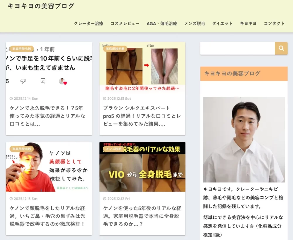 キヨキヨの美容ブログは、管理人のキヨキヨ氏が自身の美容体験を綴ったメンズ美容ブログサイトです。家庭用脱毛器を用いた長期的な経過報告や、医療脱毛クリニックの比較、さらにはニキビ跡や毛穴ケアといった肌の悩みに関する検証記事も。薄毛治療やワキガ対策など、男性特有のコンプレックスを解消するための美容医療体験も幅広く紹介しています。