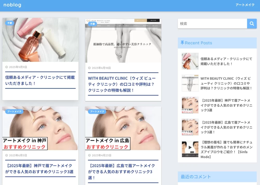 noblogは、美容クリニックのアートメイクに関する情報を中心に発信するブログです。主に、アートメイク施術を提供するクリニックの口コミ・評判・料金・特徴などを丁寧に解説しており、特にメンズ向けアートメイクにも注力しています。