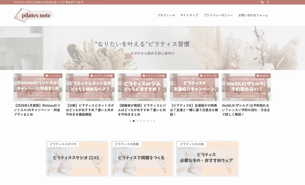 「pilates note」は、“ピラティスのことがなんでもわかるノート”をコンセプトに、ピラティス初心者から経験者までを対象とした情報サイトです。 マシンピラティススタジオの体験レビューや料金比較、ホットヨガLAVA・リントスルなどの口コミ記事に加え、資格取得体験談や渋谷などエリア別おすすめスタジオ紹介、韓国発レギンス比較レビューまで、ピラティス周辺のウェア・ジム情報も網羅的に発信しています。