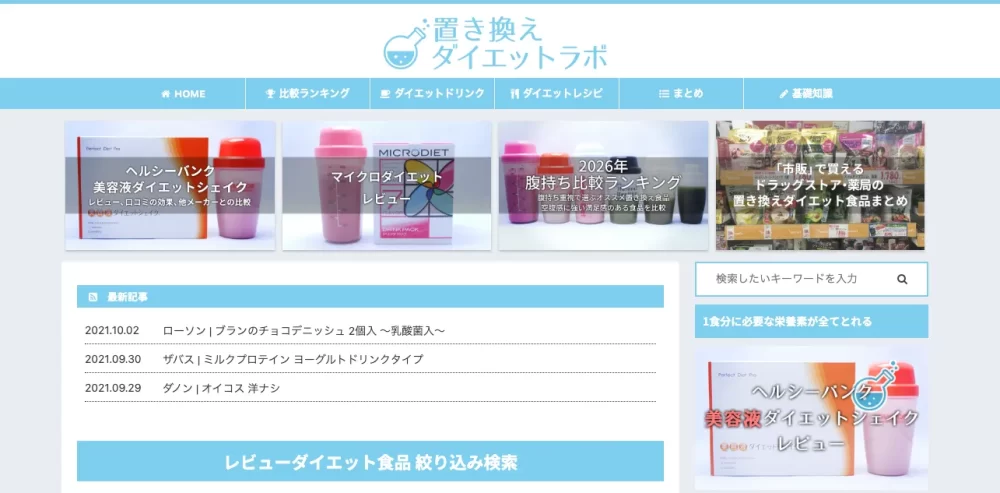 置き換えダイエットラボは、資格を持つ専門家が200種類以上のダイエット食品を実際に試して評価する「置き換えダイエット」の比較・情報サイト。ダイエットシェイクやスムージー、酵素ドリンクといった定番商品のほか、コンビニで手軽に買えるヘルシー食材の栄養成分や価格、味のレビューなども。