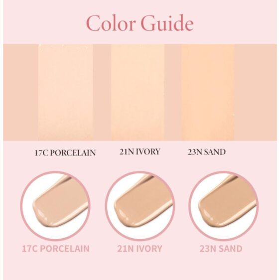 赤を選ぶ方は30色の中から色選びできますが、他のタイプのクッションファンデの場合、「17C ポーセリン」「21N アイボリー」「23N サンド」を基準に、自分の肌にあうカラーを探していきましょう。