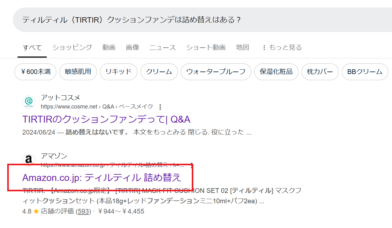 ティルティル(TIRTIR)クッションファンデのよくある質問を、化粧品メーカーで10年以上のキャリアを持つ美容のプロフェッショナルメンバーであり、化粧品開発・成分・薬事法・美容法のスペシャリストのコスメ部編集部が回答します。 ティルティルクッションファンデは、日本全国の店舗と、通販で販売されており、比較的手に入りやすいです。 【ドラッグストア・薬局】 マツモトキヨシ、ココカラファイン、トモズ、Vドラッグ、クスリの福太郎、ツルハドラッグ、ウエルシア薬局、スギ薬局、カワチ薬品、コスモス、アインズ&トルペ、サンドラッグ、ドラッグイレブン、ゲンキー、富士薬品、クリエイトSD、ハックドラッグ、クスリのアオキ... 【バラエティショップ・化粧品店舗】 shop in、東急ハンズ、ロフト、プラザ、@cosme store、キット、Urban Comfort、R.O.U. ITS'DEMO、episode、MS・Style、COLOR FiELD、キデイランド、シャンドエルブ、京王アートマン、 CoLeColle 【家電量販店・量販店(化粧品・日用品コーナーがある店舗)】 ビッグカメラ、ヨドバシカメラ、ヤマダ電機、ドン・キホーテ、イオン、セブン&アイ、アピタ 実店舗の場合、在庫切れや販売終了などの場合があり、確認が面倒な場合は通販で購入することをおすすめします。 Amazon、楽天、Qoo10、公式オンラインショップなどで販売されています。 ティルティルクッションは詰め替えは販売していません。 Googleでティルティルクッションファンデの詰め替えを検索 Amazonのページに、「ティルティル 詰め替え」と表示されていますが、クリックしてみると詰め替えは表示されません。 amazonの検索結果ページ 画像引用:Amazon 2025年4月12日現在では、ケース付きの新品を買うしかないようです。 ティルティルのクッションファンデにキープ力があり落ちにくい理由は「独特な成分処方技術」によるものです。化粧品開発者として成分を分析すると、以下の2つのメカニズムが考えられます。 【粉体コーティング技術で肌になじみやすくする】 【密着膜を作る】